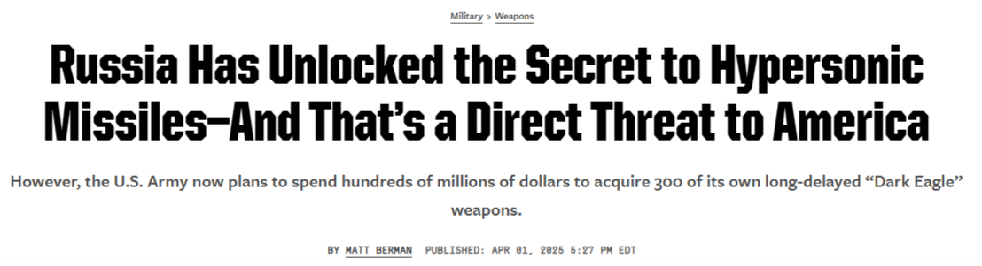 Just a week ago Popular Mechanics declared Russia as ahead in the hypersonic race: