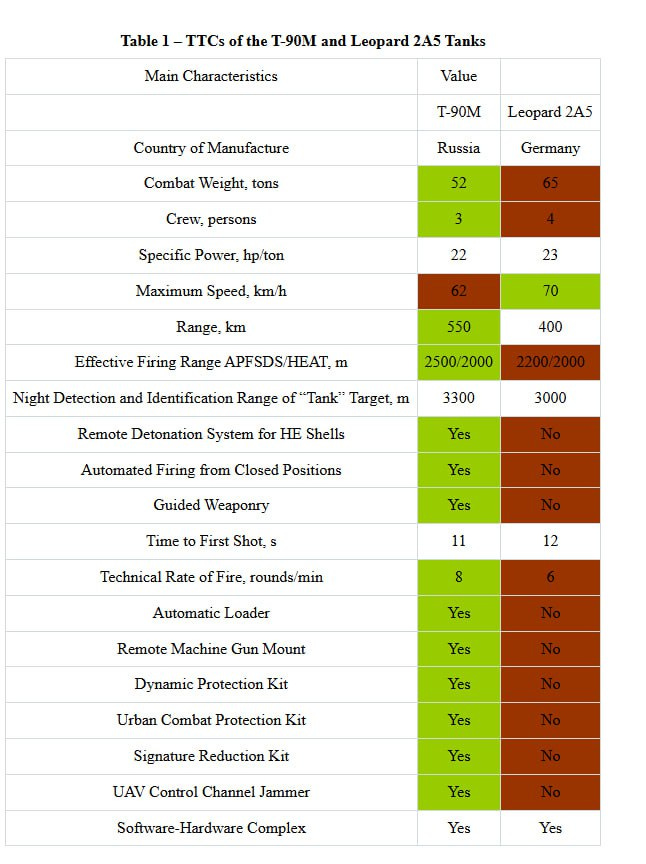 Comparative analysis showed that the T-90M tank outperforms the Leopard 2A5 in key TTCs, primarily due to the following technical solutions: