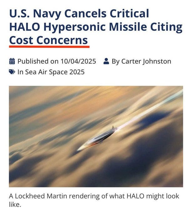 Lastly, speaking of expensive NATO weaponry, it was just announced that another of the much-vaunted American hypersonic missile projects has now been cancelled: