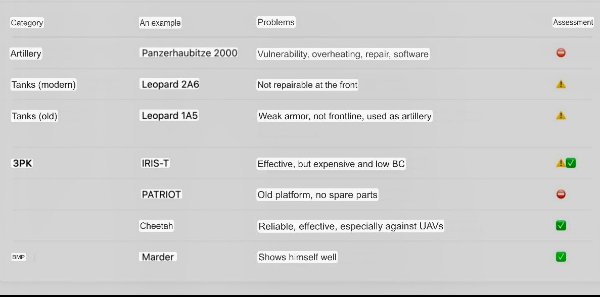 Air defense systems also face problems. The IRIS-T works well, but ammo is too costly and scarce. The Patriot system is called “unsuitable for combat” because its MAN carrier vehicles are outdated and lack spare parts.