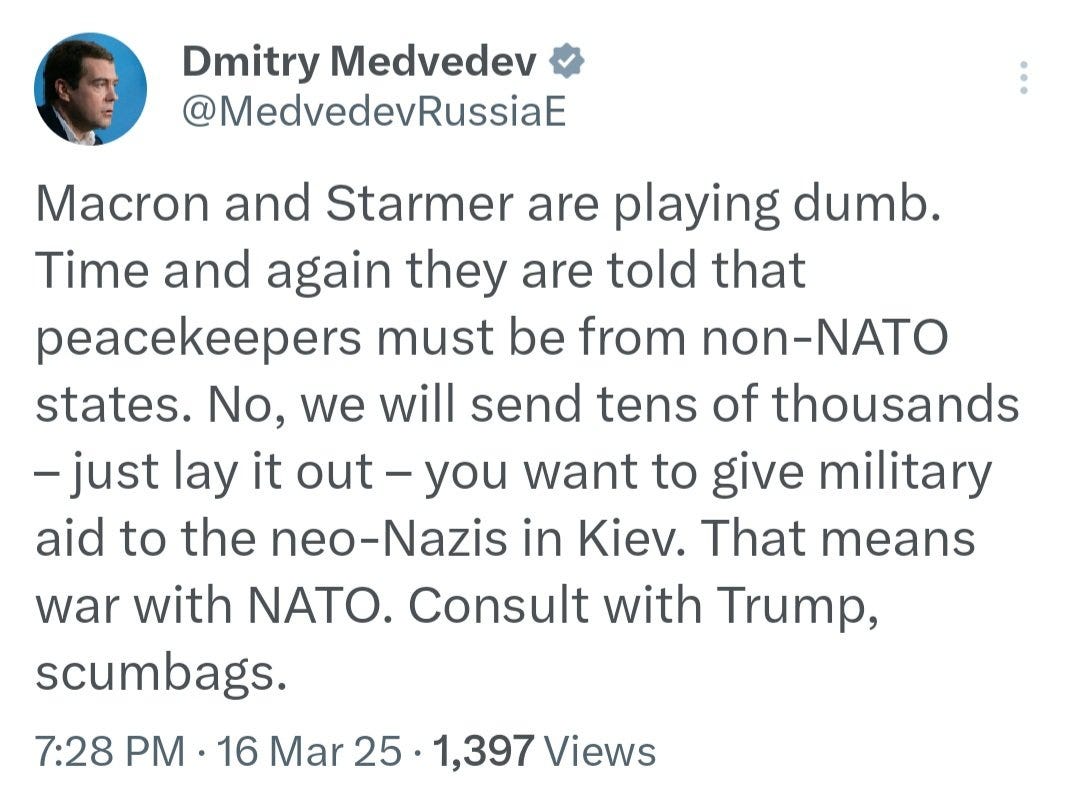 Again, it is clear that the bogus 30-day ceasefire is meant to be a trap for Russia, designed to immediately pump up Ukraine with weapons and potentially European troops—if a consensus can be reached in time.