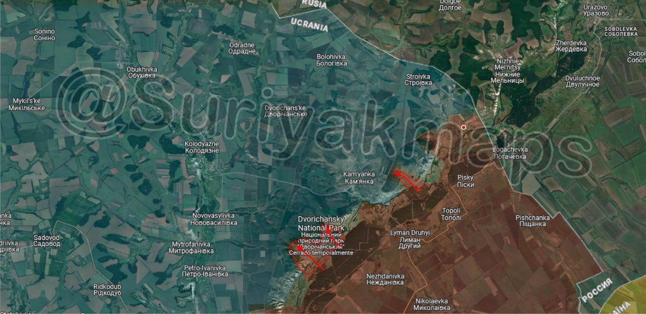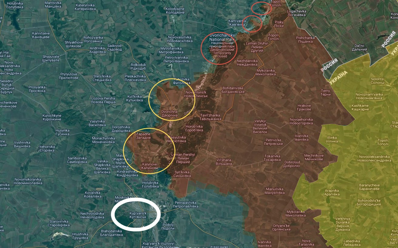 The yellow circles represent the previous lodgements across the river which have turned into full frontlines north of Kupyansk, which is circled in white. The red circles show the new bridgeheads across the river, likely at a place where Ukrainian forces are particularly thin, in order to build up the logistical rear of the forward area further south and begin encircling the town of Kamyanka nearby.
