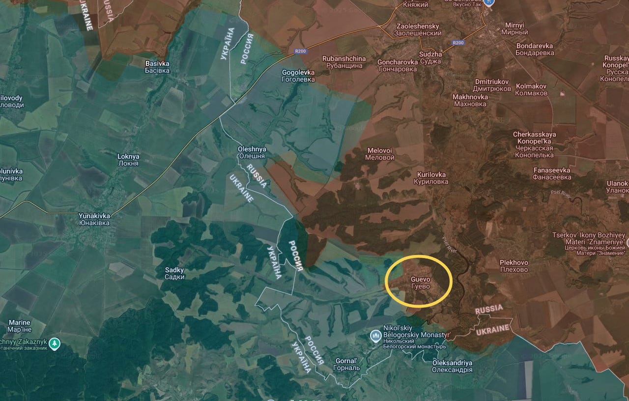 Circled in yellow is Guevo, which was captured—all that remains is some empty land west of it to the border. Sudzha can be seen at the very top for reference.