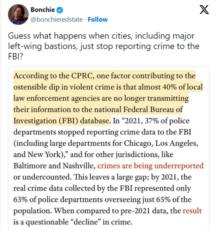 “Crime is lower than ever!” Another perpetrated lie. It turns out most Democrat cities and districts stopped reporting crimes to the FBI, resulting in “lower” figures.