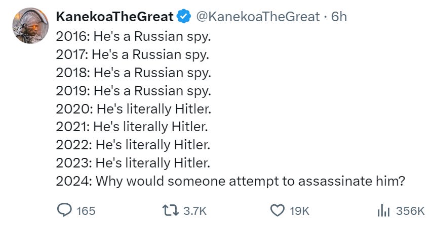 Many on the Right now brag that not a single fire was lit, nor a soul harmed in the wake of an open hit attempt on their candidate. However, some still cling to fantasies that were the shooter successful, an explosive civil war would have kicked off. But given the total normalcy and calm even in the face of near-disaster, it’s become evident that the majority of normal Americans will not “rise up” any time soon. Whether it’s a level of first world comfort that has yet to be totally eroded, or mass propagandizing, or the simple decades of docility imposed upon them by the establishment—it’s hard to know for sure. But it’s clear no one is going to “rise up” in the way some have imagined any time soon.