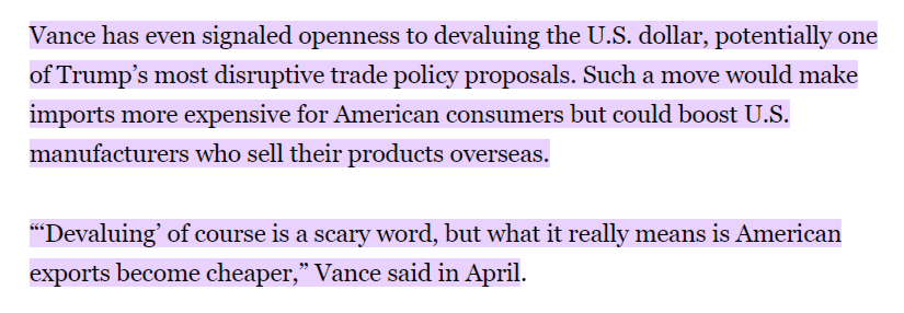 Interestingly, though, Trump and Vance’s ideas for reform are so radical—a la Javier Milei—that they may very well welcome initial ‘collapse’ of a sort in order to fundamentally restructure and recalibrate the system. For instance, Vance has now gone on record with the idea that devaluing the U.S. Dollar may be a good thing, for the purposes of trade protectionism and killing off of parasitic globalism: