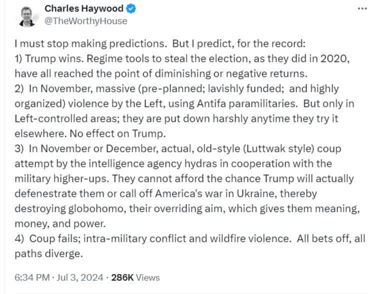 The future is uncertain. But yesterday’s assassination attempt should be a wake-up call for normies and muggles who continue to believe that “nothing ever happens.” Things are happening, and the worst is yet to come. Whether the future holds a national divorce, a civil war, an economic calamity, or a global war, I cannot say. Sadly, the one thing I least expect is peaceful transfer of power to the next President.