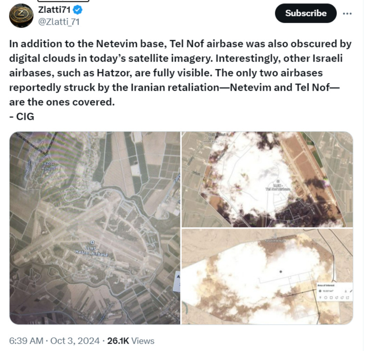What’s most interesting is there was a brief controversy yesterday surrounding some jagged digital clouds apparently being ‘painted’ over Israeli bases, blocking the ability to assess damage. This was dismissed by experts as just ‘clouds’—though strangely this rarely seems to happen in Ukraine—but most strange of all was that both penetrated bases apparently had this cloudy ‘luck’: