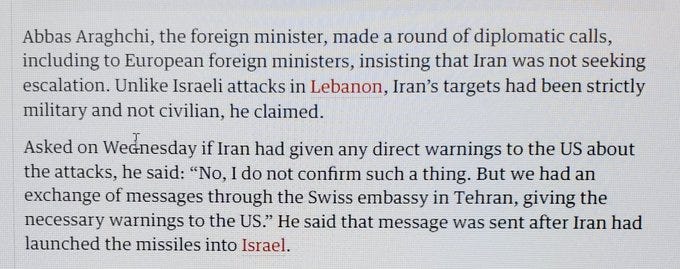 As to the question, brought up by many last time, whether Iran truly notified everyone in advance of the strikes, here is Foreign Minister Abbas Araghchi: