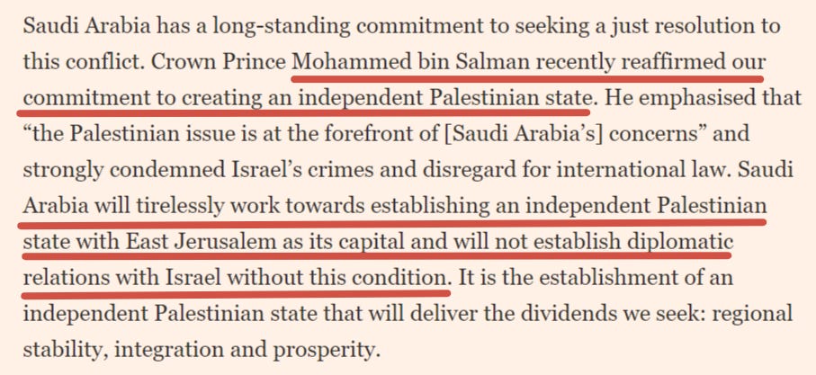 Underscoring the historic meeting, the foreign minister wrote an OpEd for FT, highlighting Saudi Arabia’s commitment to establishing an independent Palestinian state, with its capital in East Jerusalem, and no diplomatic relations with Israel until such time: