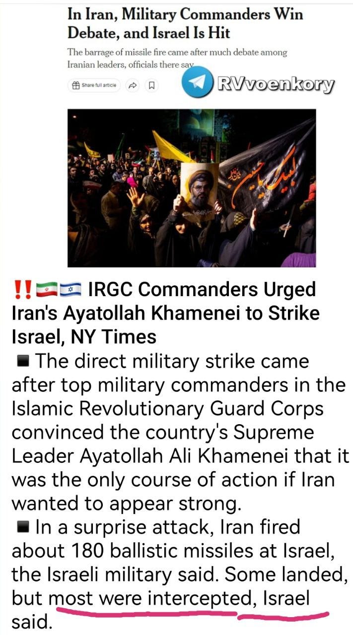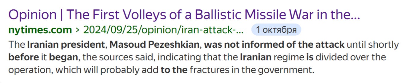 The other interesting thing was that certain contradictions within Iranian ruling elite were brought to the fore by the latest strikes. NY Times initially reported that new president Masoud Pezeshkian was not even informed of the decision to strike: