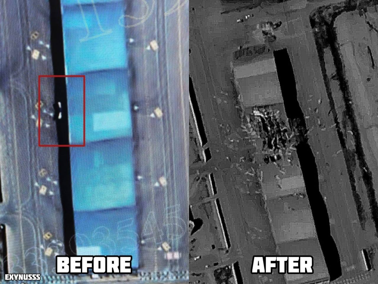 One hangar was hit which, in a previous satellite photo, had the tail of what looks like a fighter craft sticking out of it: