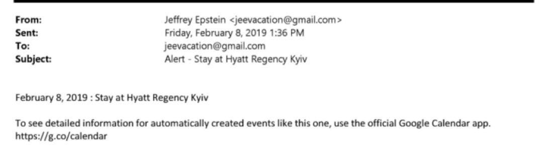 Keep in mind the message above is from May 6, 2019, a mere two weeks before Zelensky became president of Ukraine after defeating Poroshenko. In fact, just three months earlier Epstein had apparently booked a stay at the Hyatt Regency in Kiev, according to an email alert from the files: