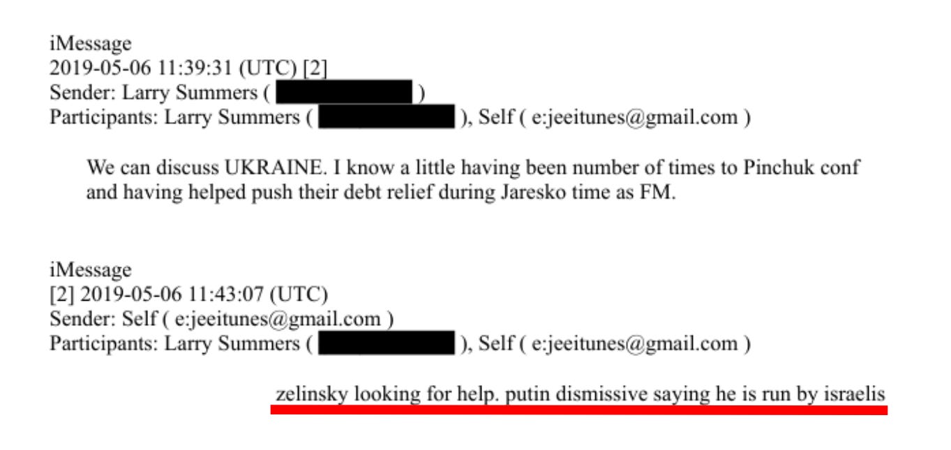 Next is an interesting exchange with Larry Summers—ex-chief economist for the World Bank, ex-President of Harvard, ex-US Treasury Secretary—wherein Epstein states that Putin deemed Zelensky to have been “run by the Israelis”: