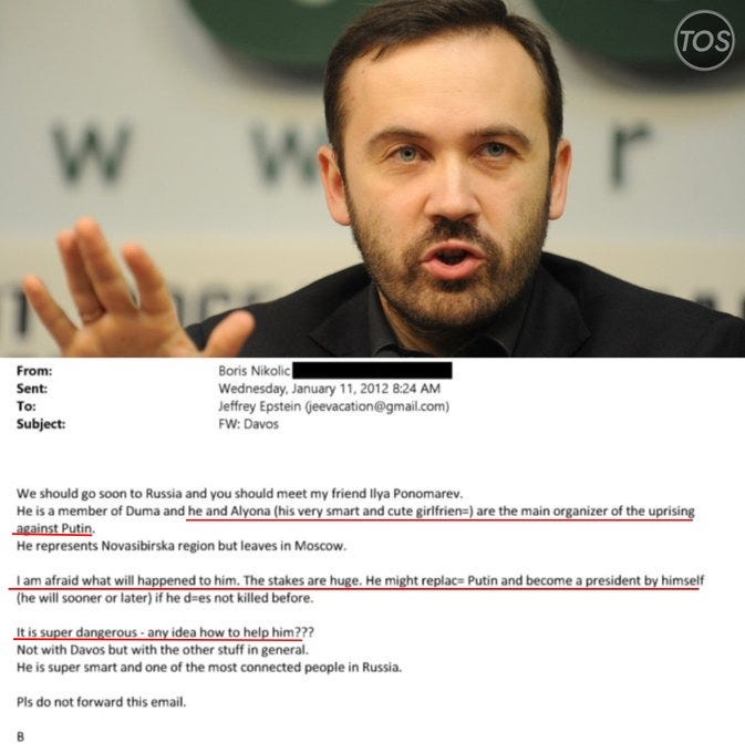 In the below exchange, Nikolic prompts Epstein to meet with Russian dissident and self-styled “opposition figure” Ilya Ponomarev, for the purpose of aiding his lifelong campaign against Putin:
