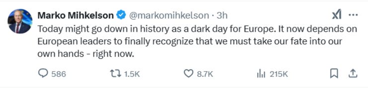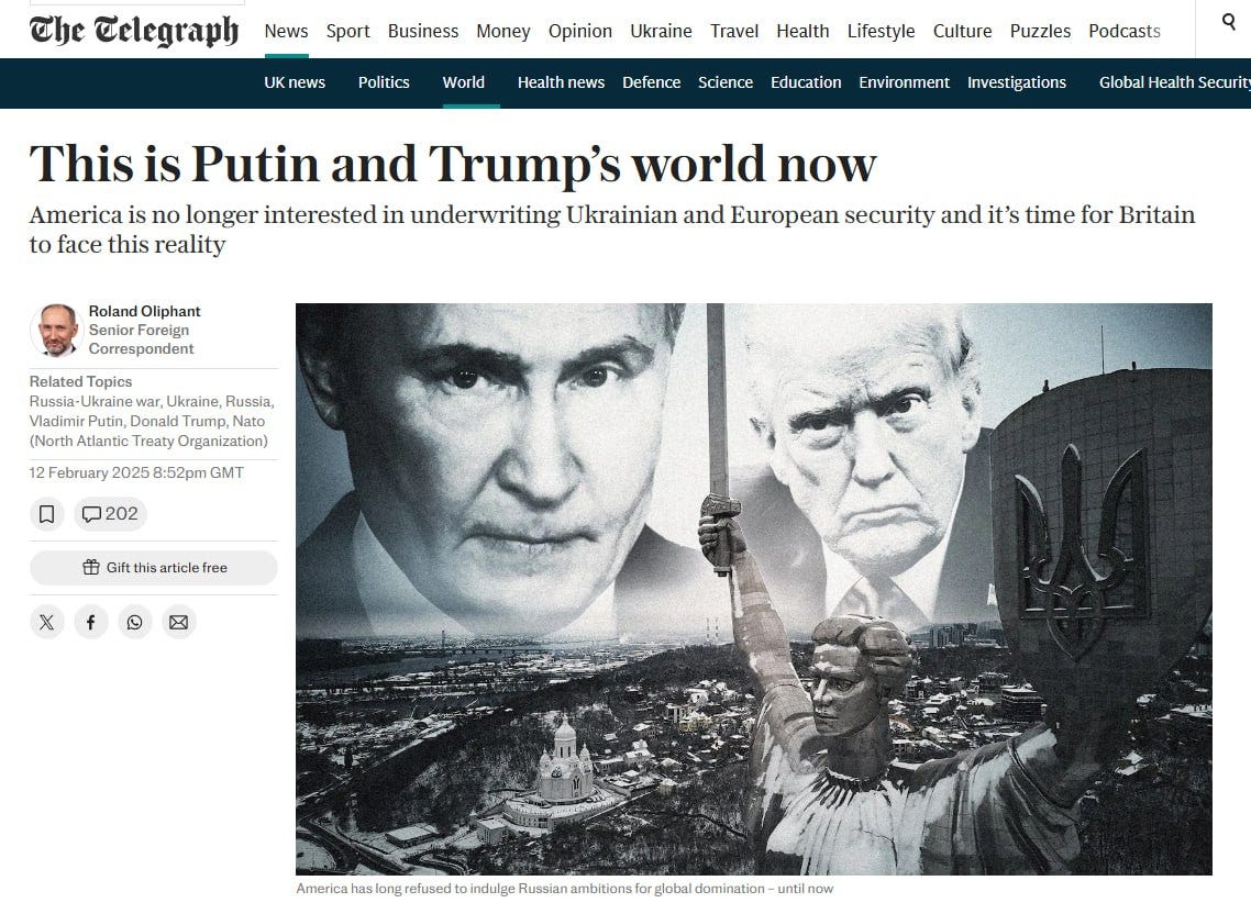 I highlight the statement above because I am seeing it as further evidence that what the Trump team wants is an off ramp instead of a peace headlined by American muscle. By highlighting the need for Ukraine to pay up on the massive American investment in light of the clear inability of Ukraine to do so, he' creating an excuse to leave Ukraine in the lurch and say that there is nothing in it for the US to keep being Ukraine's keeper.