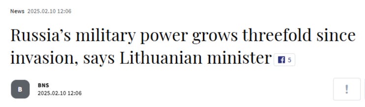 "Russia's military capabilities are already three times greater than they were when the large-scale invasion of Ukraine began three years ago. And all of this has happened in the context of an active war," the minister said in an interview with the 15min.lt news website published on Monday.