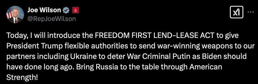 There remain many neocons still pushing for escalation against Russia which will certainly give Putin pause, vis-a-vis the point above. US congressman Joe Wilson from today: