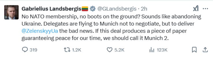 In general, the common interpretation was these short-lived localized attacks merely represent the AFU desperately wanting to put points on the scoreboard in light of all the big Trump team meetings and upcoming Munich conference. But don’t worry, Zelensky remains confident: