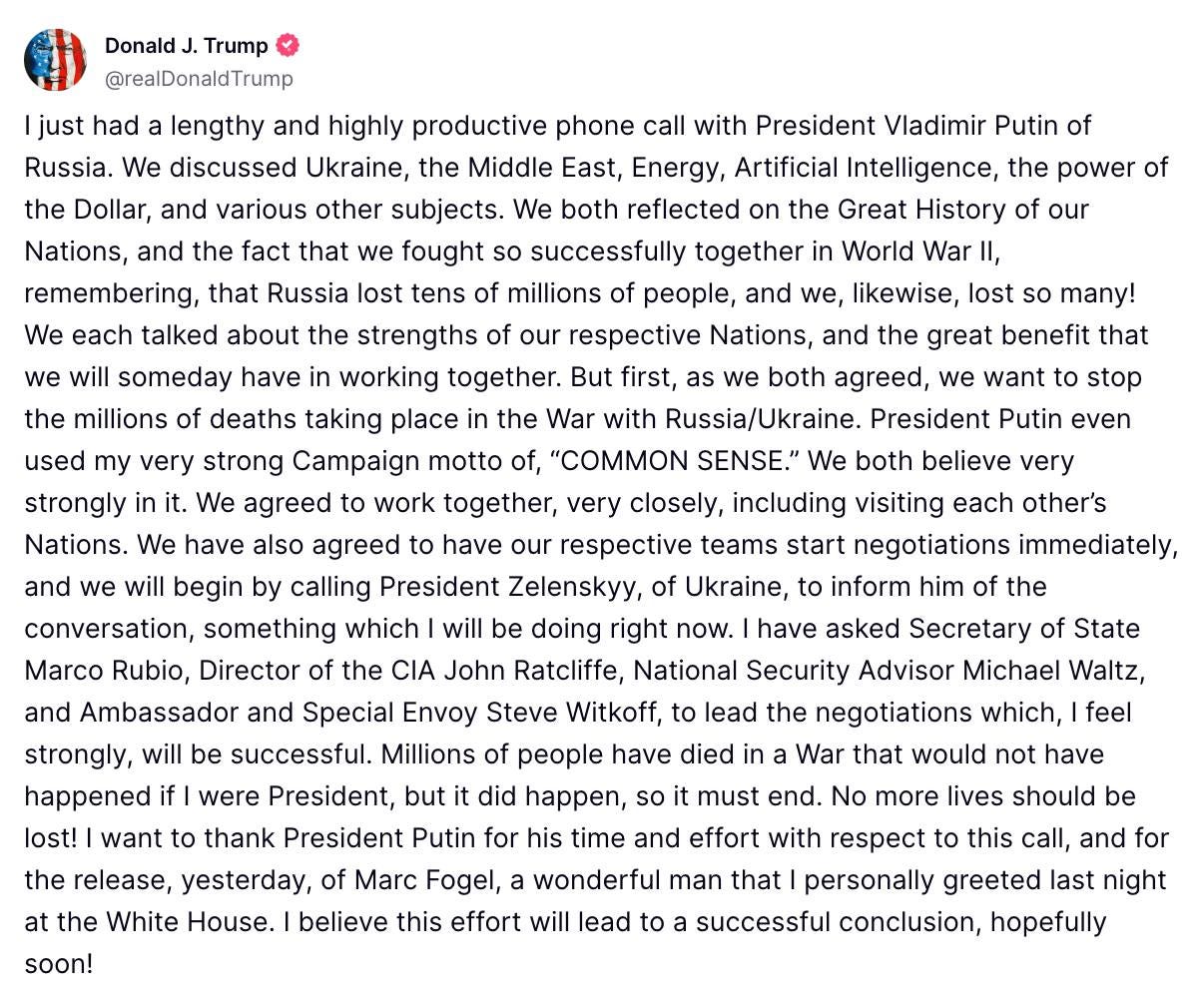 I have a somewhat different interpretation of what happened during the phone call. In general, I think you're right in that Trump may have had an initial offer from him rejected by Putin. But the fact that he treats Putin like an equal in the public statement, instead of, say, Canadian "governor" Justin Trudeau, is an indicator, I think of how he intends to conduct the inevitable negotiations with Russia. And the fact that he's hammering the "common sense" bit strikes me as him seeing how it things look from the Russian side, such as them not wanting to deal with an illegitimate Zelensky. I suspect there will be stronger calls for election in Ukraine in the future. I think Trump, far from trying to redress a diplomatic setback, is actually seeing this as a step forward. If he did see it as a setback, I think the language would be far more aggressive against Russia.
