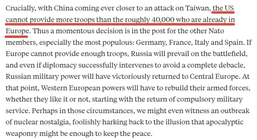 So, U.S. could provide a max 40k troops—recall most of the 101st stationed in Romania had already been redeployed to Jordan last year. Luttwak agrees that it would take most of the main NATO stalwarts for this plan to work, and they have already signaled a no-go. All combined, those countries could provide maybe 150-250k troops maximum, and that’s on the optimistic end. Meanwhile, Russia already has an entire fresh 500k man army raised by Shoigu waiting for them, which was created precisely to counter-act the new NATO threats, as I reported long ago. That’s not to mention hundreds of thousands of more reserves troops, including the conscript forces and national guard, that Russia could bring to bear if worse came to worse.