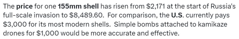 So, even the current 28,000 monthly production x $3000 is costing $84 million a month, or $1 billion per year. 100,000 shells per month at that rate—and the price may even go up in the future—would cost a whopping $300,000,000 per month, and nearly $4B per year. Without a major ongoing aid package, there is simply no way that the U.S. will continue stealthily pumping $4B just for Ukraine’s 155mm shells—that’s not counting the countless other armaments they need on a daily basis. This is one aspect I have a feeling no one has looked at: they simply “expect” that no matter what happens, Ukraine will continue getting its basic artillery shells, at the minimum; but who said that was a given? There is simply no mechanism for upwards of $4B yearly to be doled out for free without special congressional accommodation—after all, the presidential PDA (drawdown authority) is mostly gone.