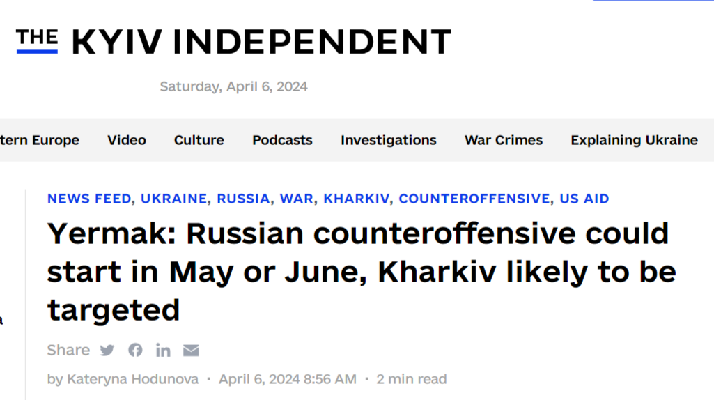 Another point of urgency—recall all the talk about Kharkov heating up. Now even Zelensky’s gray eminence, Yermak, is admitting to the possibility of Russian forces moving on Kharkov soon: