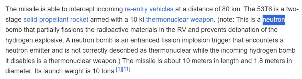 But the real final buck-stopper is Russia’s true strategic missile defense system: the A-135, and A-235—also called Nudol. The A-135 is specifically designed to take out nuclear ICBMs, rather than being a jack-of-all-trades like the S-400/500 systems. But it is a final stopgap system as the A-135 missiles, which are called 53T6, themselves are nuclear. But they are neutron bombs instead of regular fission atomic bombs. They shoot up at a mind boggling acceleration of 0 to Mach ~10 (some sources, like Wiki, have it Mach 17, but I believe 10 is more realistic, as per Russian domestic sources) in only 3-4 seconds, pulling 200gs. Once they reach the altitude of over 80km where the incoming nuclear ICBM or MIRV’d warheads are approaching, the neutron bomb detonates which essentially causes the enemy’s nuclear RVs (re-entry vehicles) to go inert, by chemically defusing them: