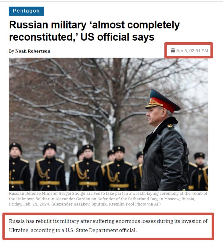 You see, in reality, they just make up whatever assessment fits the current model of narrative or agenda it’s convenient for them to push. When the agenda called for valorizing Ukraine, they called Russia weak and ‘destroyed’. But now that they see the only way to stop Russia is to get a unified Europe involved, they characterize Russia as not only totally ‘rebuilt’, but even—as per the second half of his statement—having “newfound capabilities” which now—surprise, surprise!—happen to pose a threat to Europe too!