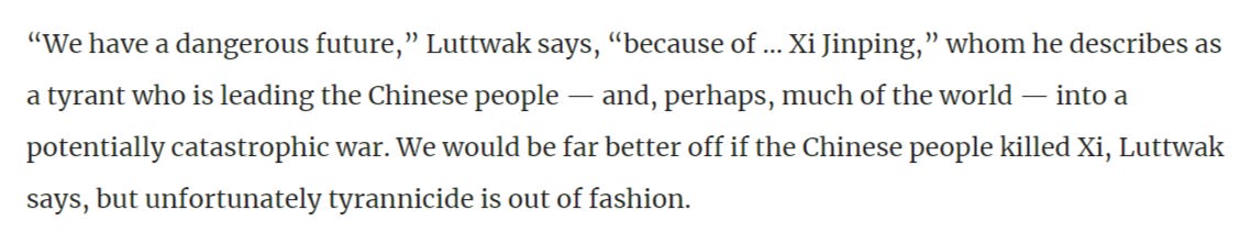 Interestingly, he frames everything around the urgency of an imminent Chinese attack on Taiwan, which further adduces his poor analytical abilities. This snippet from a previous article on Luttwak tells you everything you need to know about him: