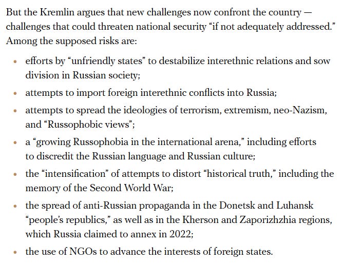 It likewise heavily focuses on ‘foreign meddling’ and attempts to stoke inter-ethnic conflicts within Russia’s border zones.