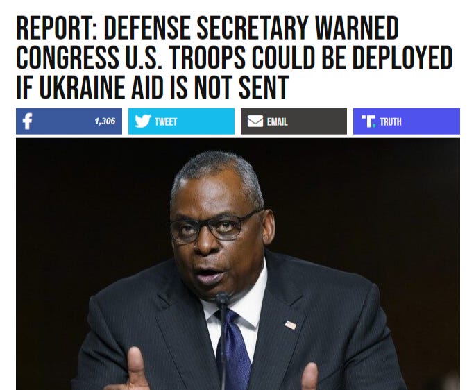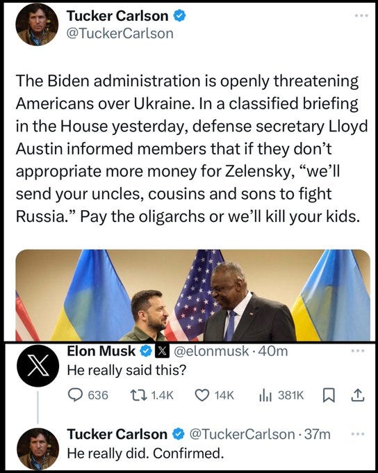 But most startling of all, is a new report, which Tucker Carlson says is “confirmed” by his private sources, that Lloyd Austin has resorted to outright threatening the Republican House holdouts, telling them “We’ll send your kids to fight Russia” if they don’t break their deadlock over the Ukrainian aid: