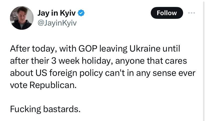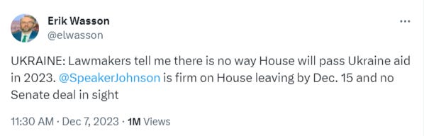 So it sounds like the Ukrainian aid may be completely dead for the rest of this year. Congress will soon go on Christmas recess. After that, the prospects are dim for a long time.