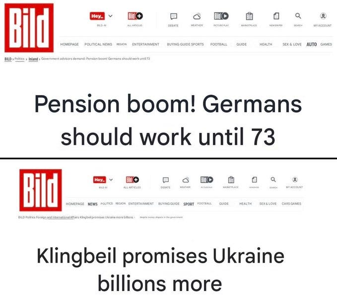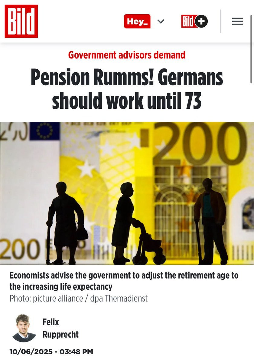 In Germany, there is a proposal to raise the retirement age to 73 due to a lack of funds, defense spending, and Ukraine.
