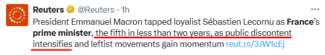 Without hesitation Macron has appointed Sebastien Lecornu as new prime minister, the same Lecornu who has been the defense minister of France for years, and under whose “leadership” the French military was sent packing from Africa, leading to the slow unraveling of the decaying former-power.