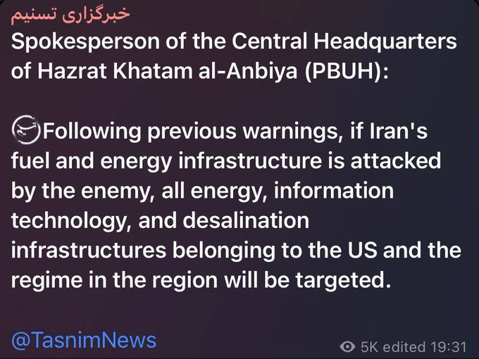 The Spokesman for the Khatam-al Anbiya Central Headquarters, the unified combatant command headquarters of the Iranian Armed Forces, has stated following tonight’s 48-hour ultimatum by U.S. President Trump, that if the United States attacks fuel or energy infrastructure in Iran, then they will attack U.S. and allied energy, information technology, and desalination infrastructure across the Middle East.