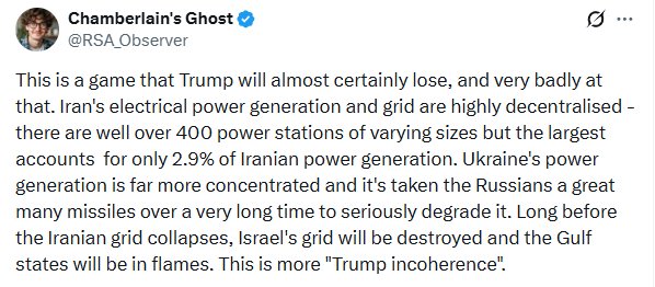 Multiple experts and commentators have noted that Iran’s power grid is extremely decentralized, comparatively speaking, and that Trump’s attacks on power plants will likely not be as effective as he envisions.