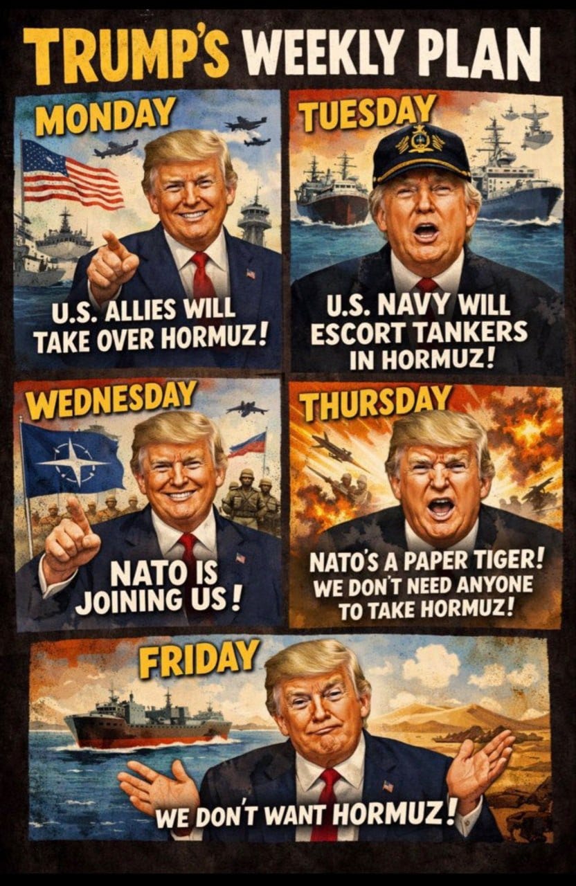 In short: more than likely the Marine operation is nothing more than a desperate head fake—as per usual—to wreathe Trump in an air of authority, command, and victory. When the Tripoli arrives he’ll have no choice than to blame allies for their “cowardly” inability to reopen the Strait for him, then deflect into some new headline-grabbing ruse or distraction, or simply claim his destruction of Iran’s power plants has “crippled Iran for good” before withdrawing with tail between his legs.