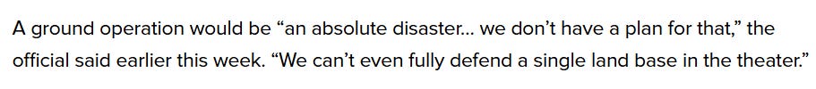 The most likely deal with the Marines and claimed “ground operation” is that Trump is merely fumbling for time, winging it with the “strategic ambiguity” card in order to fool the press into thinking he’s following some kind of plan. In reality, the amphibious ship’s transit merely buys him crucial panic moments and gives him precious time to improvise more excuses, or simply hope his military finds a way out of the bungled disaster he’s fomented.