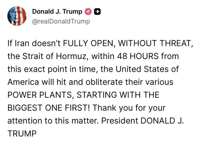 Perhaps after getting a “call” from his superior in the wake of PR-ruining “mass casualty events” in Israel, Trump launched into another frantic flip-flop, this time threatening Iran’s civilian power plants should the Strait which he himself just yesterday dismissed as irrelevant not be immediately re-opened within 48 hours: