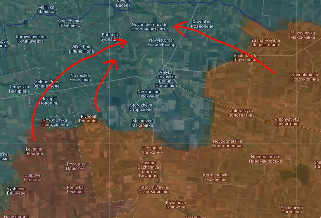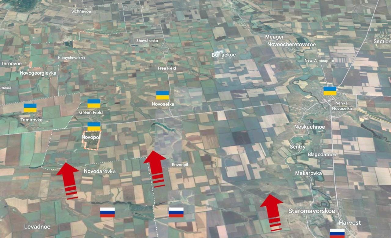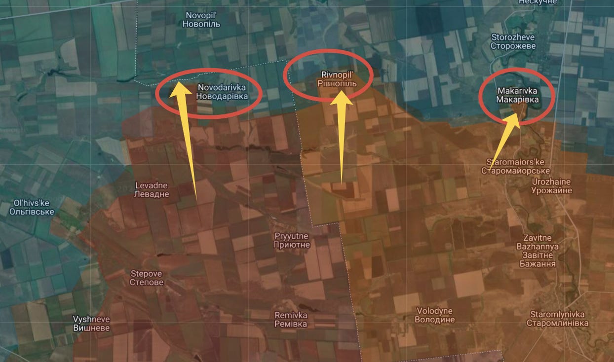 On Zaporozhye, you may recall just a couple weeks ago or less that Russian forces sprang out and captured Levadne on the western side of Velyka Novosilka. Now they have captured some or most of Novodorovka and all of Rivnopol: