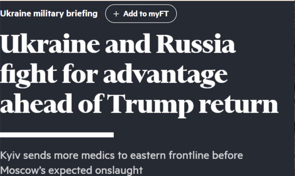 As corollary to the Economist piece comes a new FT piece underscoring the mad scramble to hold as much territory as possible to jockey for ‘negotiating positions’ on the eve of Trump’s return to power.