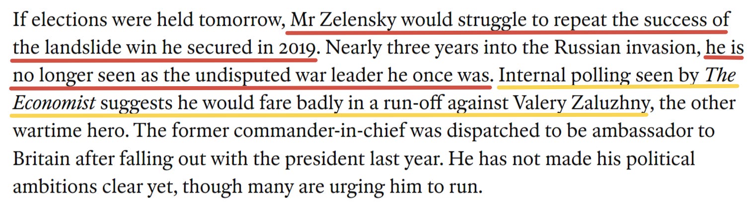 Not only did Economist now roll out some “internal polling” that seemingly didn’t exist before, but the big kicker is the predictable insertion of Zaluzhny as new heir to the throne. That’s not to mention the suggestive lay out of their preferred outcome: