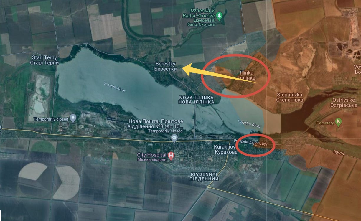 Russian forces captured more of the eastern portion of Kurakhove itself (smaller circle on bottom), while capturing Illinka and advancing toward Berestky, where clashes were already reported: