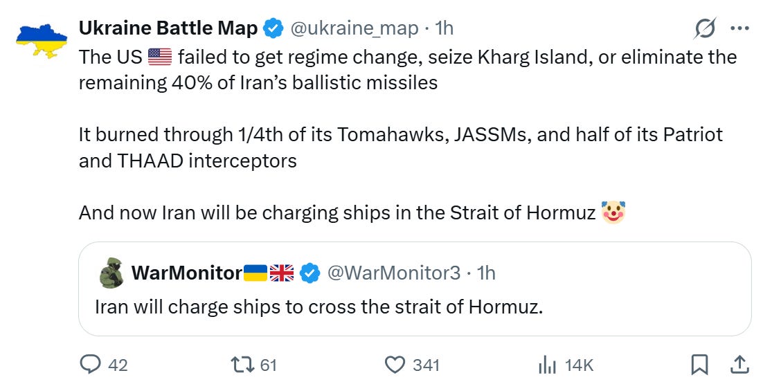 One small correction to the above: Iran has specified that for its demanded ‘reparations’ it is willing to accept the new transit fees from the Strait of Hormuz as sufficient toward that debt.