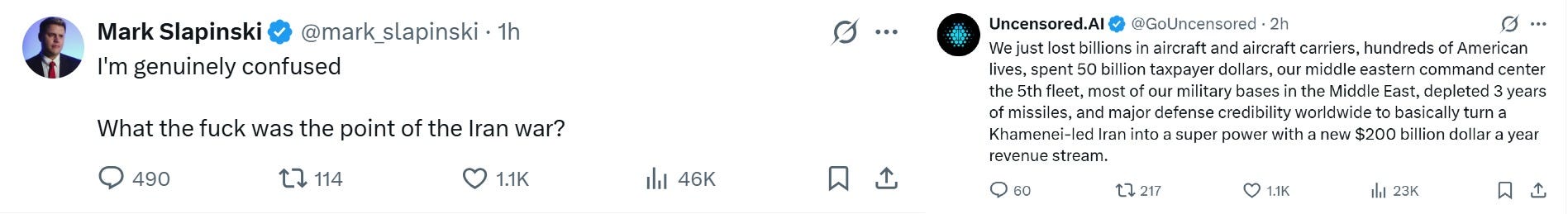 The other reason for the ceasefire was likely oligarch pressure on Trump to allow markets time to cool and renormalize. We’ve been writing for a while now how Trump’s “strategy” is simply keep bombing to buy time in the hopes that Mossad and the CIA can figure out what’s happening internally and orchestrate a real overthrow or total chaos.