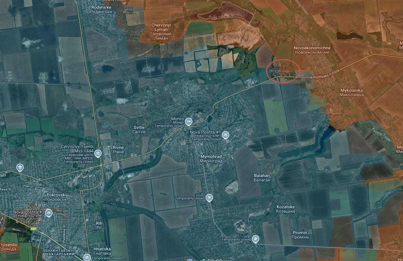 Meanwhile, on the Mirnograd front next to Pokrovsk, Russian forces were geolocated via a Ukrainian sniper video to have taken positions in this industrial sector on the T-0504 road: