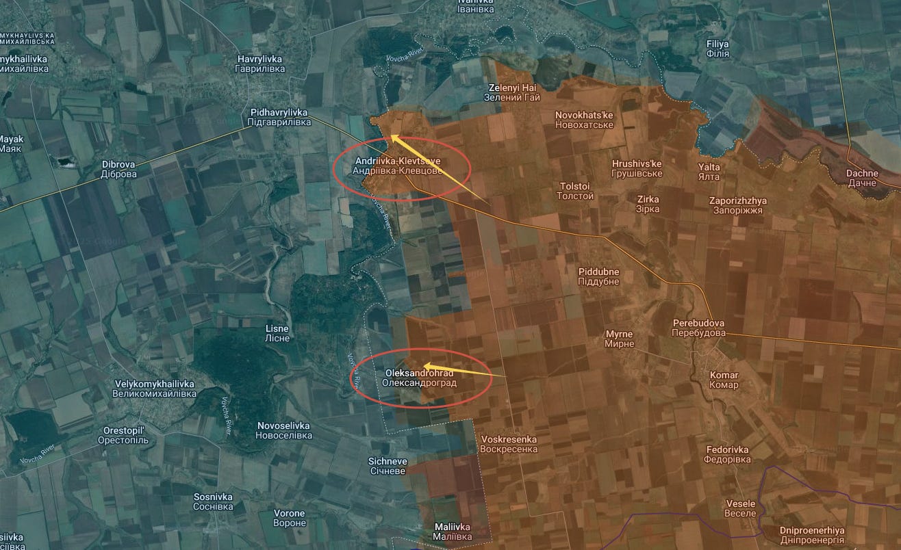 But those weren’t even the biggest advances of the day. That honor goes to the total capture of Iskra and Aleksandrograd, southwest of Pokrovsk, on the old Velyka Novosilka sector: