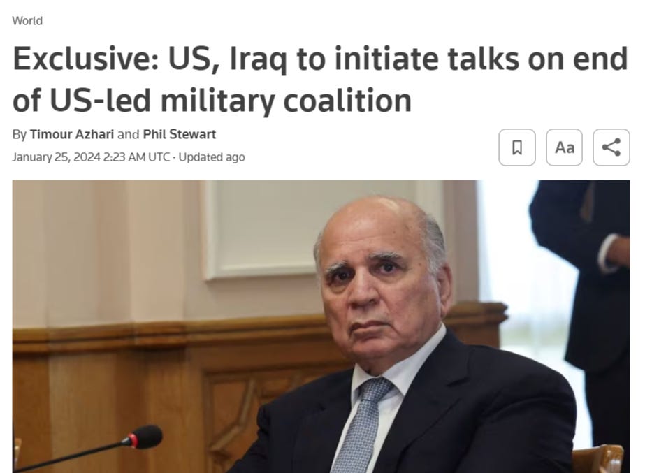 Reuters, citing sources: Initial talks between America and the government in Baghdad about ending the presence of coalition forces in Iraq against the backdrop of developments that took place as a result of the war in Gaza. The United States of America made the end of its presence a condition that it stop strikes by resistance factions on its bases in Iraq. The United States expressed its readiness to begin talks with the Iraqi government in a letter delivered by the United States Ambassador to Iraq, Alena Romanowski, to Iraqi Foreign Minister Fuad Hussein on Wednesday.