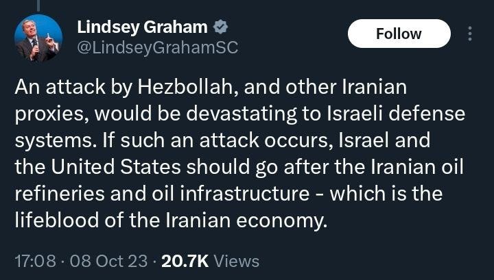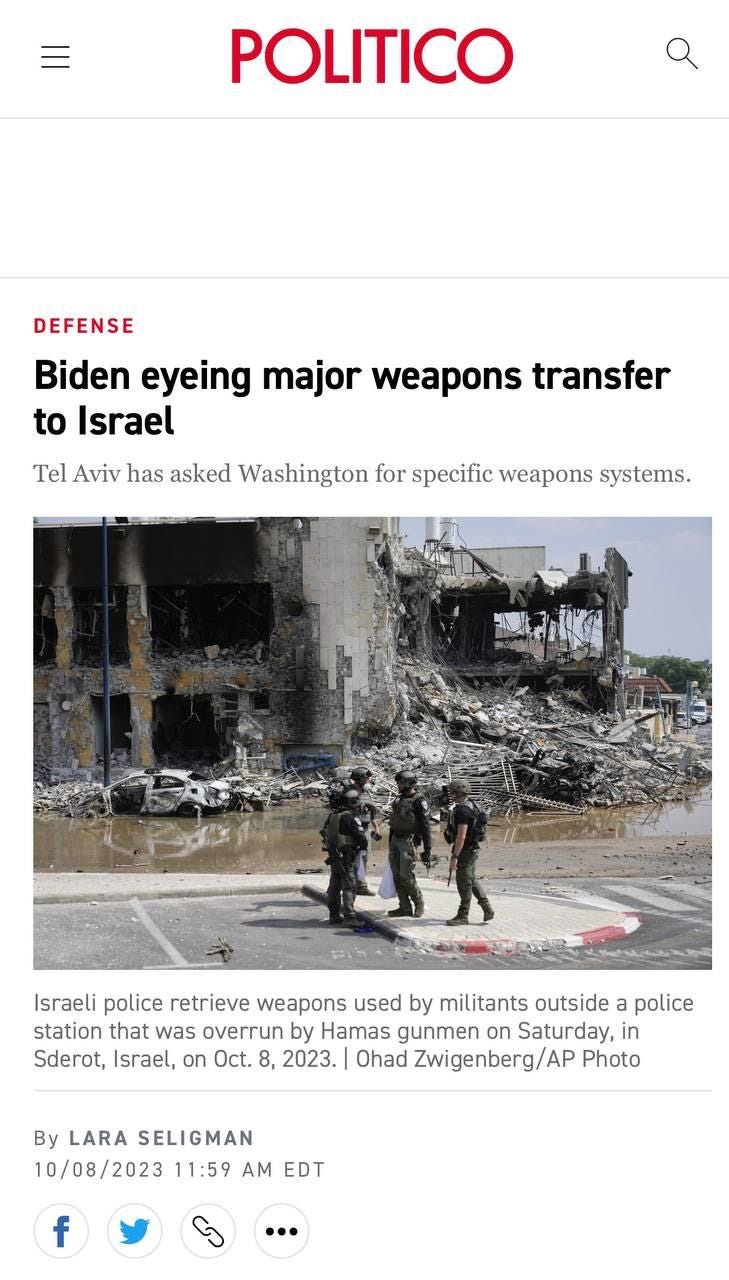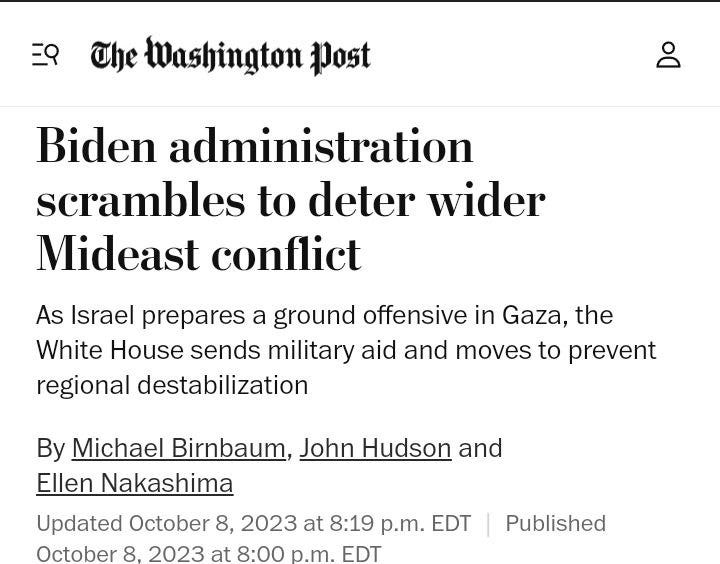 But in fact the U.S. just announced the dispatching of the USS Gerald R. Ford aircraft carrier battlegroup to the eastern Mediterranean region. You don’t send that much firepower if you mean to make peace and de-escalate. Not to mention U.S. military C17 cargo planes have already been landing in Israel, likely transporting new arms.